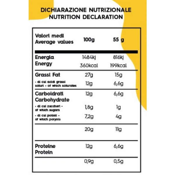 Ingredienti: fibra di frumento, crema 18% (proteine del latte, edulcorante: sciroppo di maltitolo, tuorlo d’uovo 3,6%, burro di cacao, acqua, olio di cocco, agente di carica: eritritolo 3,3%, olio di girasole, emulsionante: lecitina di girasole), margarina vegetale (burro di cacao, olio di girasole, acqua, succo di limone concentrato), acqua, burro, proteine di frumento, edulcoranti (maltitolo, sciroppo di maltitolo), inulina, proteine isolate di fava, albume d'uovo, trigliceridi a catena media (MCT), amido di frumento modificato, emulsionanti: mono- e digliceridi degli acidi grassi, stabilizzante: sciroppo di sorbitolo, lievito, sale, edulcoranti (ciclamato di sodio, acesulfame K, sucralosio), conservante: sorbato di potassio, aromi.