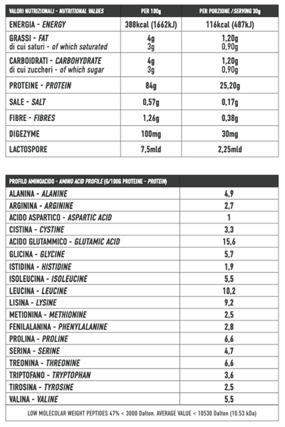 Idrolizzata al 100%: Con una struttura molecolare frammentata, questa proteina si assorbe rapidamente e offre una maggiore presenza di aminoacidi a basso peso molecolare.